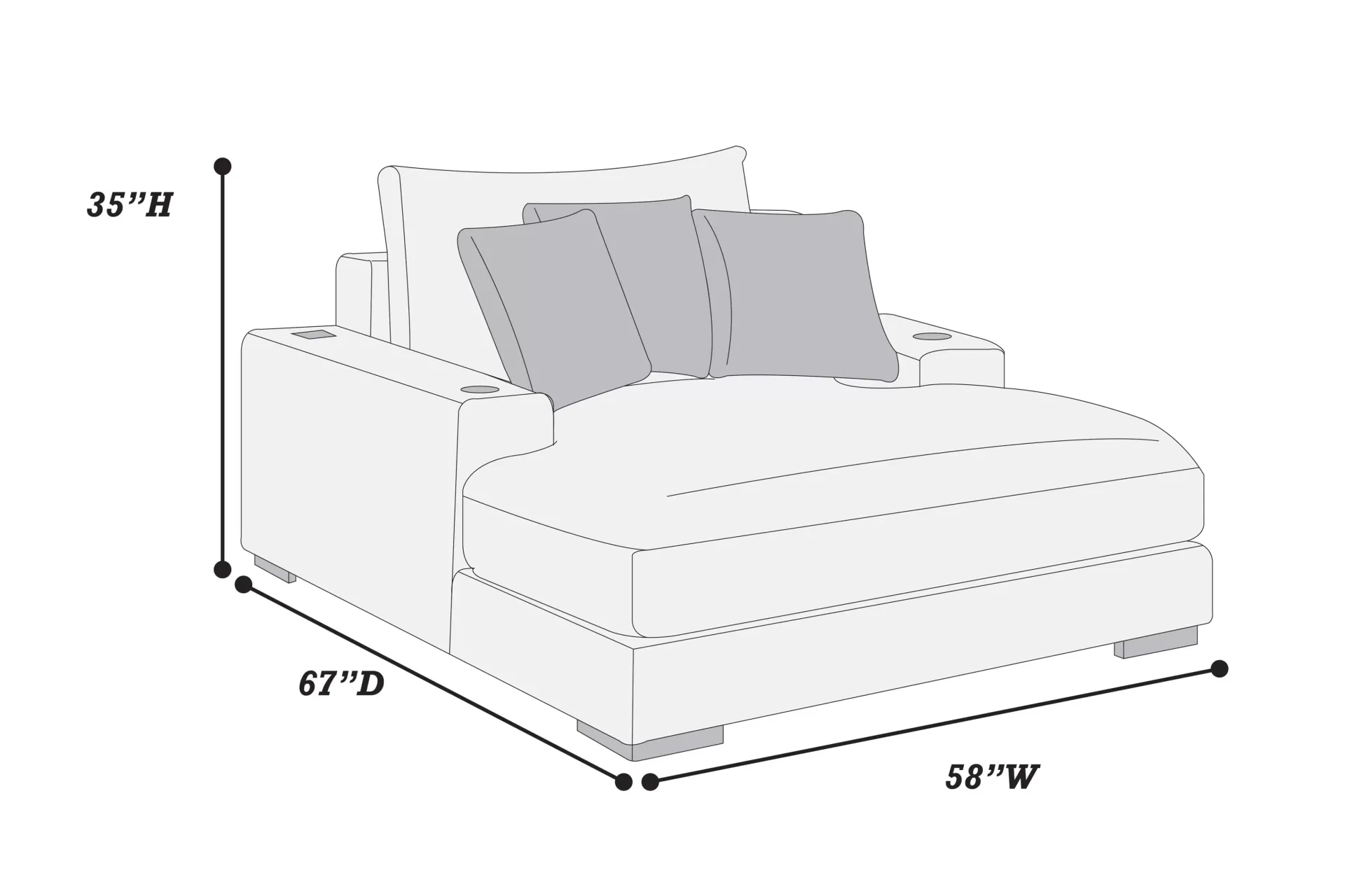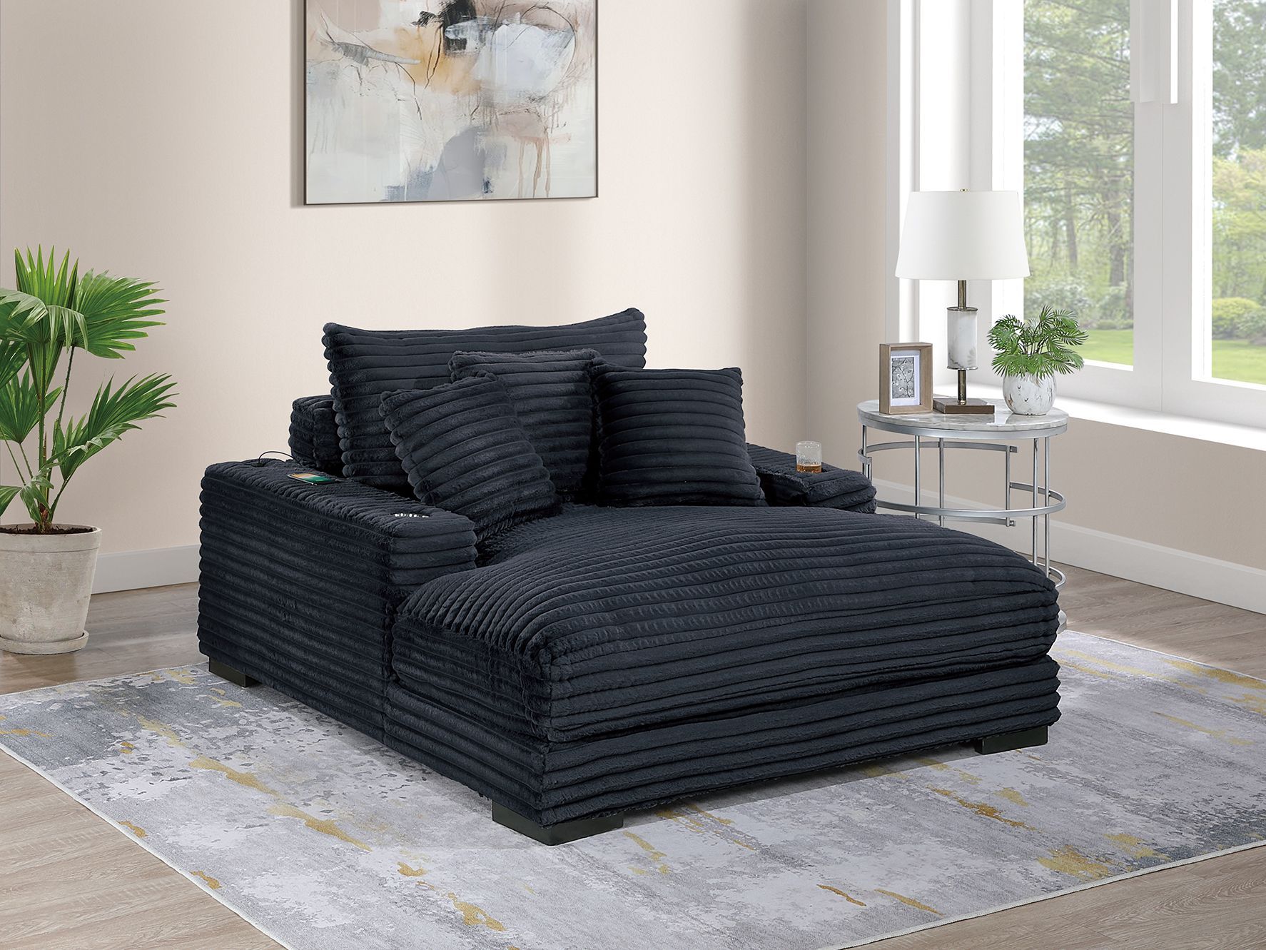 Indulge in comfort with the Fur-Like Jumbo Corduroy Chaise Lounge, designed for unparalleled comfort and style. Wrapped in plush fur-like jumbo corduroy fabric, every touch offers a sensation of warmth and softness, making it a perfect retreat after a long day. The low-profile legs provide stability without compromising the sleek, modern aesthetic, ensuring it blends seamlessly into any living space. Experience convenience at your fingertips with integrated features including two built-in cup holders and a USB port discreetly nestled in the back of the armrest. Whether you're enjoying a movie marathon or catching up on your favorite book, staying connected and hydrated has never been easier. Sink into bliss with generously cushioned back pillows that provide ample support while enhancing the chaise's inviting appeal. For added coziness, three accent pillows are included, each meticulously selected to complement the lounge's design and provide personalized comfort. The Chaise Lounge redefines relaxation with its blend of functionality, comfort, and contemporary design. Elevate your living space and unwind in style with this exquisite addition to your home.