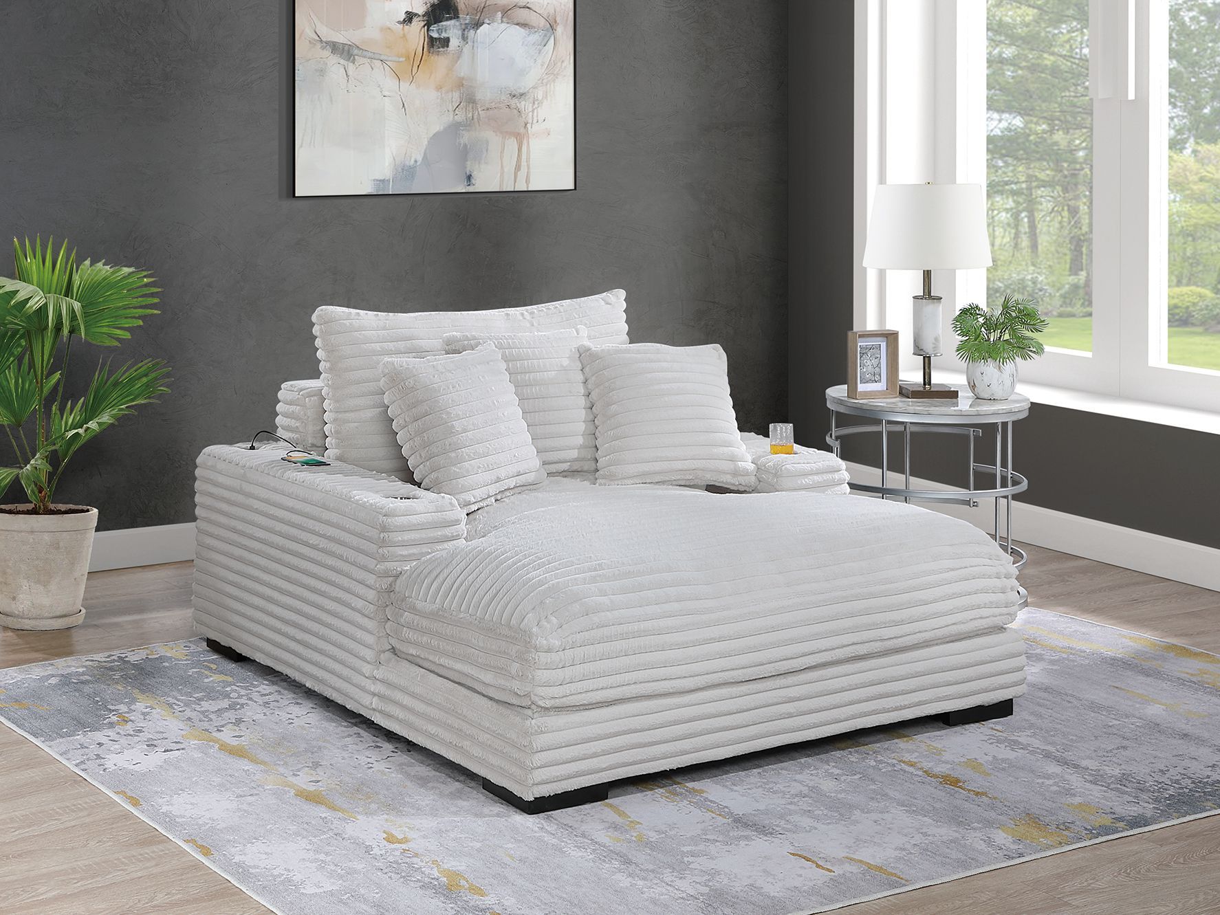 Indulge in comfort with the Fur-Like Jumbo Corduroy Chaise Lounge, designed for unparalleled comfort and style. Wrapped in plush fur-like jumbo corduroy fabric, every touch offers a sensation of warmth and softness, making it a perfect retreat after a long day. The low-profile legs provide stability without compromising the sleek, modern aesthetic, ensuring it blends seamlessly into any living space. Experience convenience at your fingertips with integrated features including two built-in cup holders and a USB port discreetly nestled in the back of the armrest. Whether you're enjoying a movie marathon or catching up on your favorite book, staying connected and hydrated has never been easier. Sink into bliss with generously cushioned back pillows that provide ample support while enhancing the chaise's inviting appeal. For added coziness, three accent pillows are included, each meticulously selected to complement the lounge's design and provide personalized comfort. The Chaise Lounge redefines relaxation with its blend of functionality, comfort, and contemporary design. Elevate your living space and unwind in style with this exquisite addition to your home.