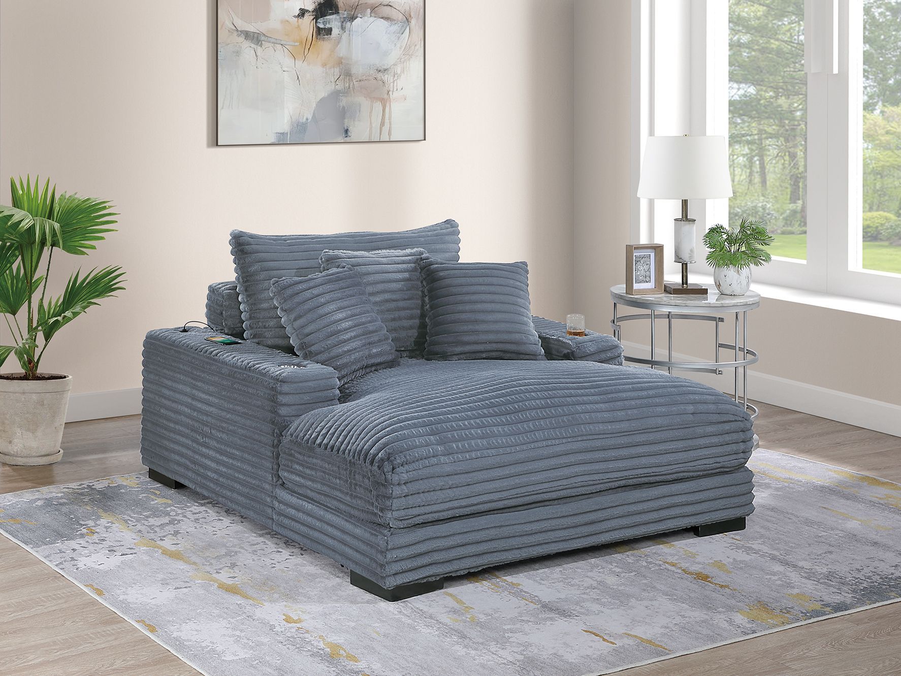 Indulge in comfort with the Fur-Like Jumbo Corduroy Chaise Lounge, designed for unparalleled comfort and style. Wrapped in plush fur-like jumbo corduroy fabric, every touch offers a sensation of warmth and softness, making it a perfect retreat after a long day. The low-profile legs provide stability without compromising the sleek, modern aesthetic, ensuring it blends seamlessly into any living space. Experience convenience at your fingertips with integrated features including two built-in cup holders and a USB port discreetly nestled in the back of the armrest. Whether you're enjoying a movie marathon or catching up on your favorite book, staying connected and hydrated has never been easier. Sink into bliss with generously cushioned back pillows that provide ample support while enhancing the chaise's inviting appeal. For added coziness, three accent pillows are included, each meticulously selected to complement the lounge's design and provide personalized comfort. The Chaise Lounge redefines relaxation with its blend of functionality, comfort, and contemporary design. Elevate your living space and unwind in style with this exquisite addition to your home.