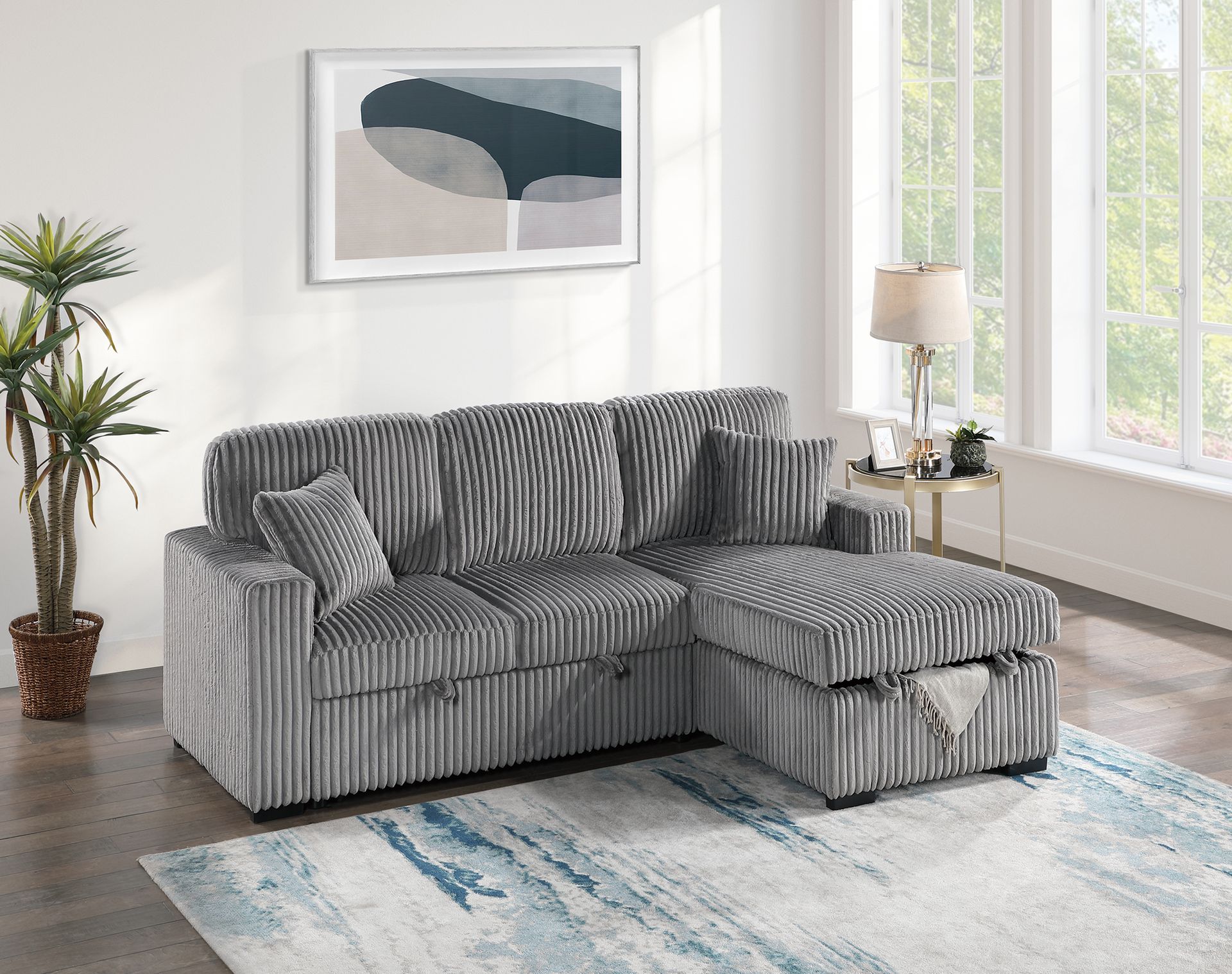 Designed to blend style, comfort, and functionality seamlessly. This stunning piece extends to provide leg rest with a simple, easy-to-use handle, allowing you to unwind effortlessly after a long day. Crafted from luxurious soft corduroy material, this sectional promises an inviting touch and feel, perfect for cozying up with family and friends. The sectional comes with two matching throw pillows, adding an extra layer of comfort and a cohesive look to your decor. The back cushions are thoughtfully designed to be removable, offering you the flexibility to adjust them to your liking or to clean them with ease. For added convenience, the middle back cushion drops down to reveal two cup holders, providing the perfect spot for your beverages during movie nights or casual gatherings. The chaise not only enhances the seating capacity but also comes with hidden storage, ideal for stashing away blankets, pillows, or other living room essentials. This Convertible Sectional is perfect for small apartments, guest rooms, or any space where versatility is key.