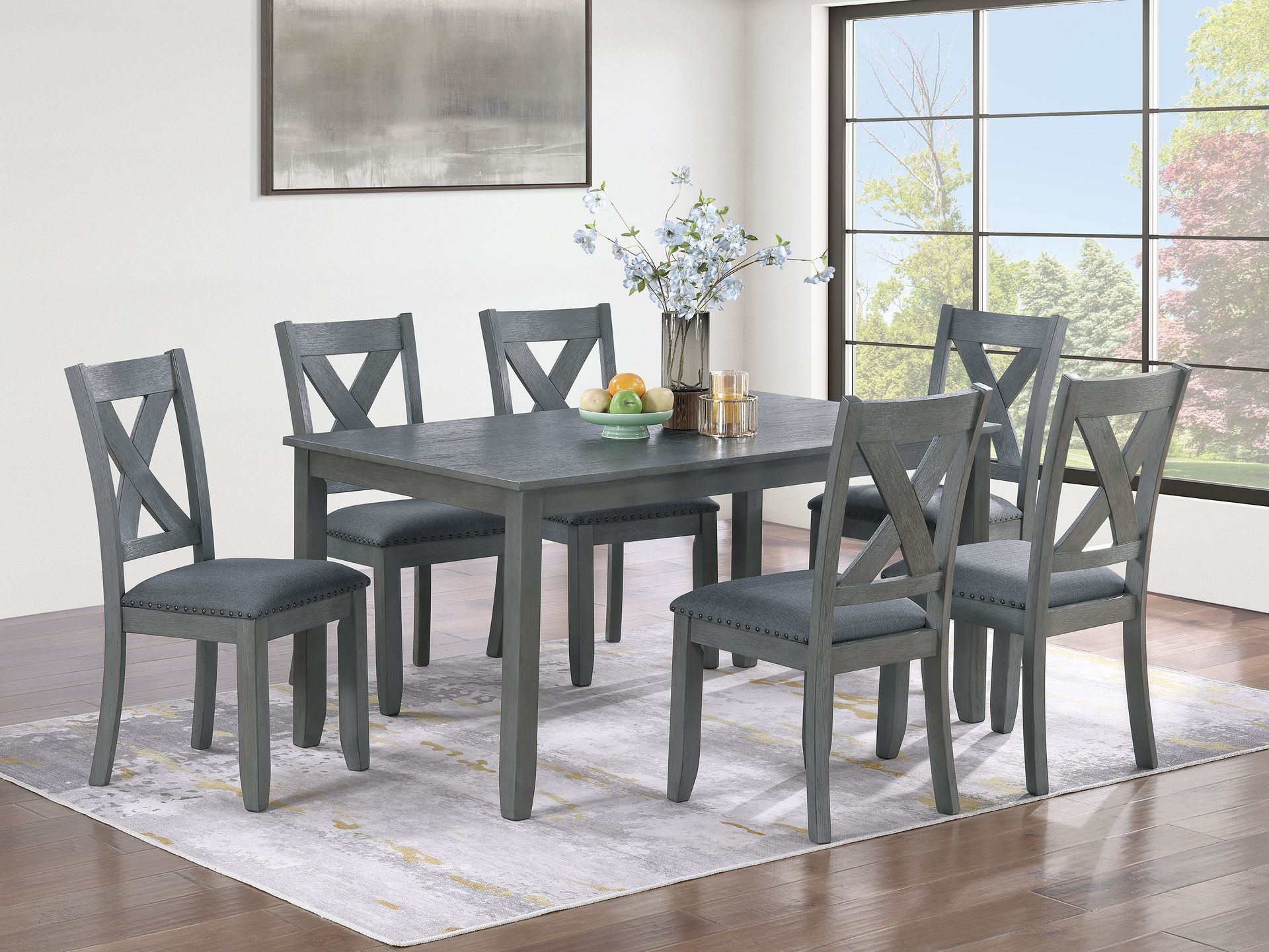 Gather your family or guests around this inviting 7-piece dining set, designed to bring warmth and character to your dining room or kitchen. The set includes a rectangular table and six coordinating dining chairs, offering a cohesive look that blends function with charm. The tables wide measure, provides ample space for meals, game nights, or casual conversations. Its tapered legs give it a sleek silhouette that feels both grounded and refined. The natural wood frame enhances its timeless appeal, making it easy to style with a range of interior looks—from casual to more formal settings. Each chair is thoughtfully crafted with a cross-back design that adds a hint of farmhouse influence. The seats are generously cushioned and upholstered for added comfort, making them perfect for lingering over dinner or coffee. A row of nail head trim outlines the seat, adding a tasteful detail that gives the set a slightly upscale touch without being too ornate. Whether you're hosting a dinner party or enjoying everyday meals, this dining set offers a well-balanced combination of comfort and style. The matching elements help tie your space together, while the table’s clean lines and the chair’s distinctive backrest create a welcoming space for any occasion.