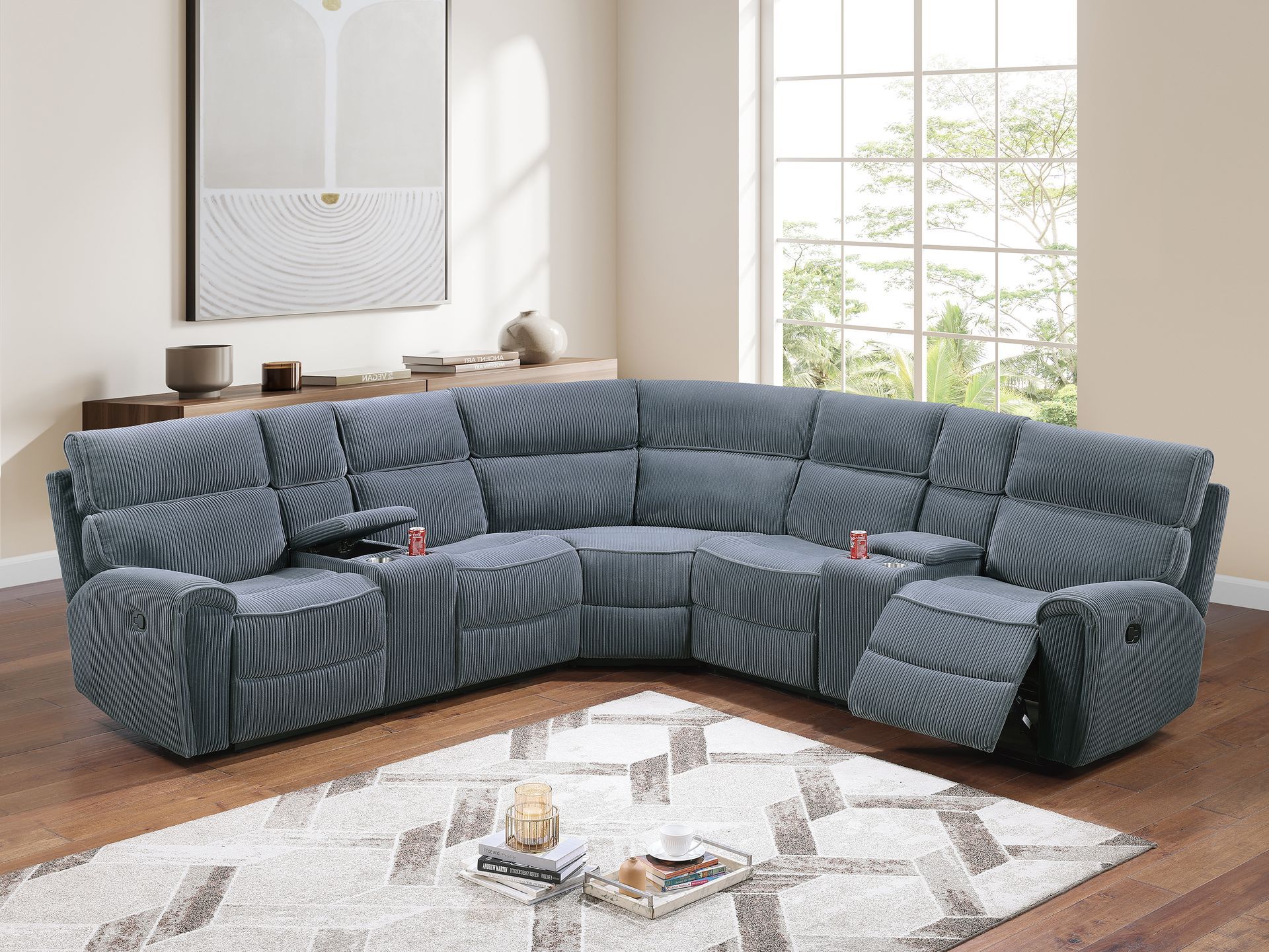 - Two built-in consoles offer practical storage space for your living room essentials while also including dual cup holders to keep your drinks secure and nearby.