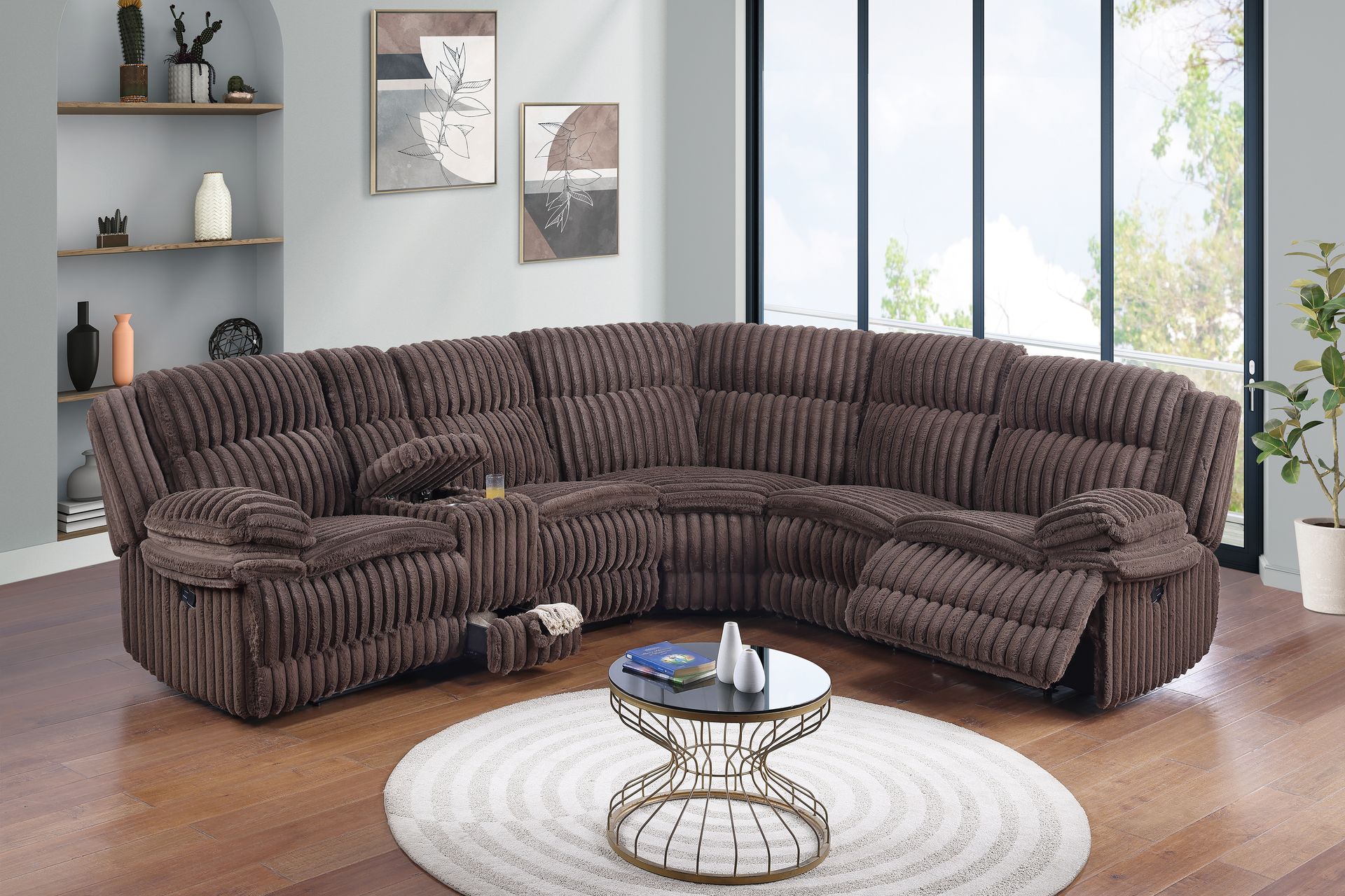 Designed to provide a cozy seating experience, this U-shaped sectional is upholstered in luxurious fur-like corduroy, offering a soft and inviting texture that complements its sleek design. The sectional is thoughtfully crafted with plush, thick armrests that cradle you in comfort while adding a touch of elegance to your living space. Both the left-arm-facing loveseat and right-arm-facing loveseat feature manual reclining mechanisms, conveniently located on the sides of the armrests. With just a simple pull of the handle, you can effortlessly recline into your ideal lounging position. The corner wedge completes the U-shaped design, providing ample seating space for family and friends to gather. The sectional includes a center console equipped with two cup holders, perfect for keeping your favorite beverages within reach during movie nights or relaxation time. The console also features a spacious storage compartment, ideal for stowing away remotes, magazines, or other essentials. Additionally, a small storage space at the base of the console adds extra convenience for organizing smaller items. Whether you're entertaining guests or enjoying a quiet evening at home, this recliner sectional is designed to provide unmatched comfort and timeless appeal.