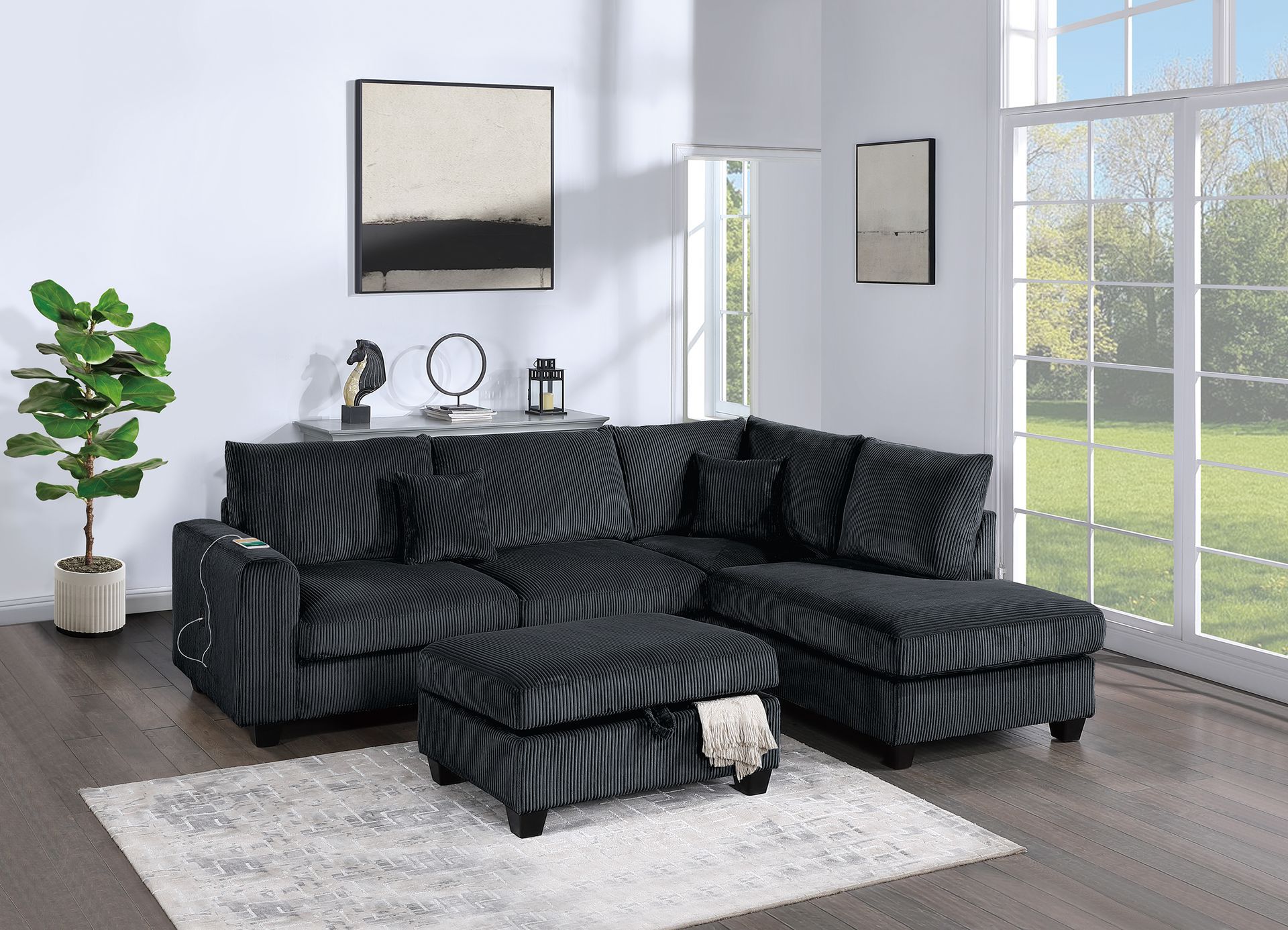 This 3-Piece Sectional Set is designed to redefine comfort and style in your living space. Experience convenience at your fingertips with the Left Arm Facing (LAF) Sofa, featuring a built-in USB port for easy charging of your devices. Sink into relaxation with the Right Arm Facing (RAF) Chaise, offering ample space to stretch out and unwind after a long day. Making it the perfect spot for lounging, reading, or simply enjoying your favorite movie. Maximize your living room storage with the included Storage Ottoman, perfect for stashing away blankets, magazines, or remote controls, it seamlessly blends style with functionality. Crafted with corduroy material soft to the touch and adds a touch of sophistication to your living space. Complete with two throw pillows, this 3-Piece Sectional Set is the epitome of modern elegance and comfort.