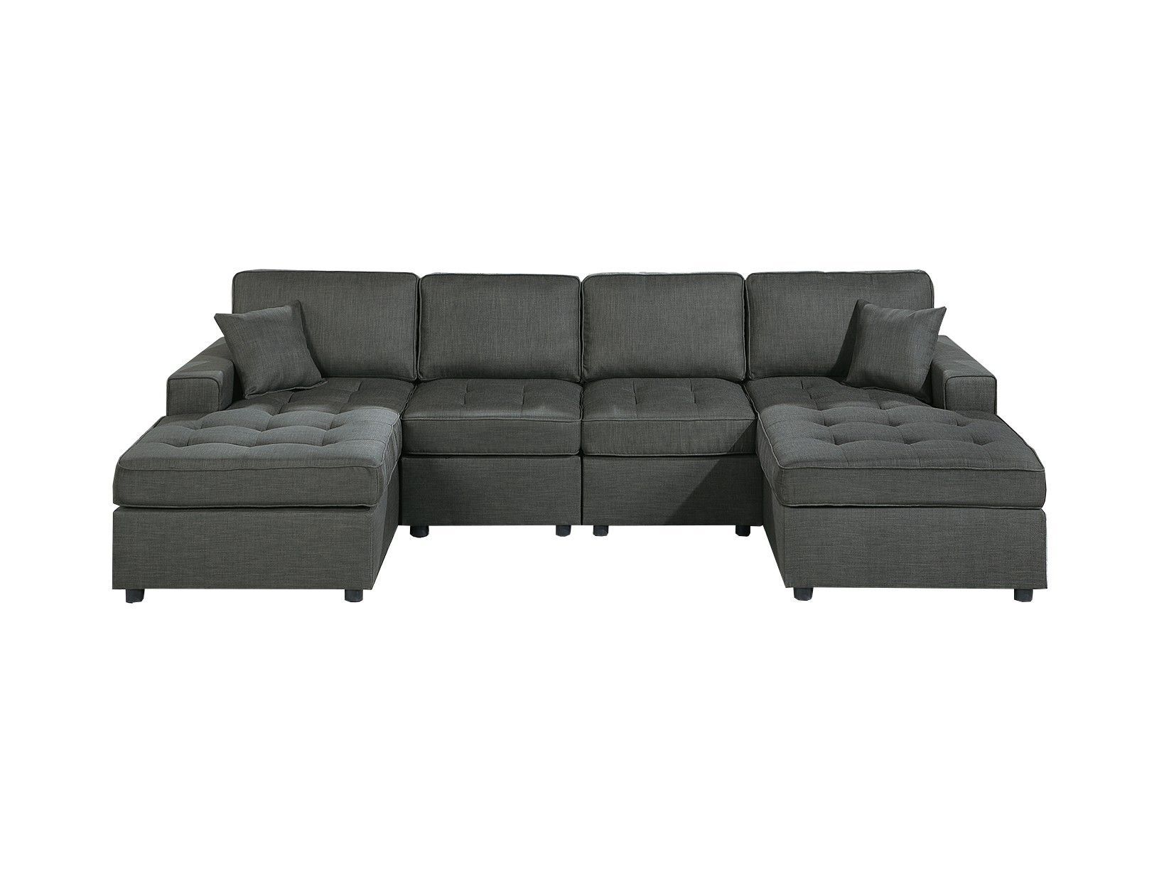 Whether you're entertaining guests or enjoying a quiet evening in, this Double Chaise Sectional Sofa promises to be a centerpiece of comfort and elegance in your home. Experience the perfect blend of form and function with this versatile addition to your living space. This sectional features a RAF/LAF Chaise and two armless chairs strategically arranged to create an inviting armless loveseat. The Dorris Fabric material's subtle texture adds depth to the overall aesthetic, making it a perfect fit for modern and contemporary interiors alike. The dimensions are thoughtfully crafted to fit seamlessly into various room sizes. The RAF/LAF Chaise provides ample space for stretching out and lounging comfortably. Elegant square arms frame the sectional, offering both support and a clean, structured look that complements the tufted seats. The low-profile design adds a touch of sophistication while maximizing seating space without overwhelming your room's layout. Included with the sectional are two matching throw pillows, enhancing both comfort and visual appeal. Their complementary fabric and design tie the ensemble together, creating a cohesive look that elevates your living room's style.