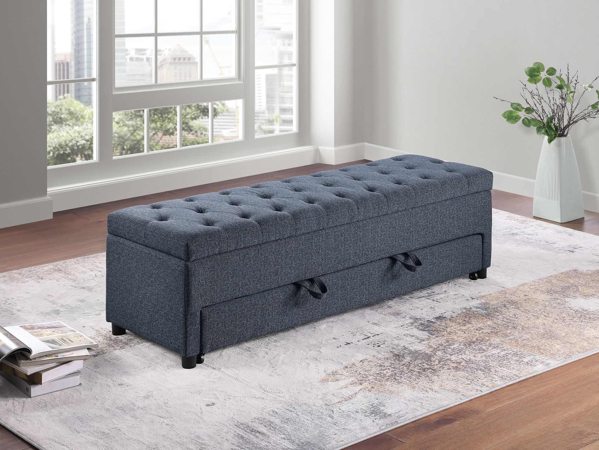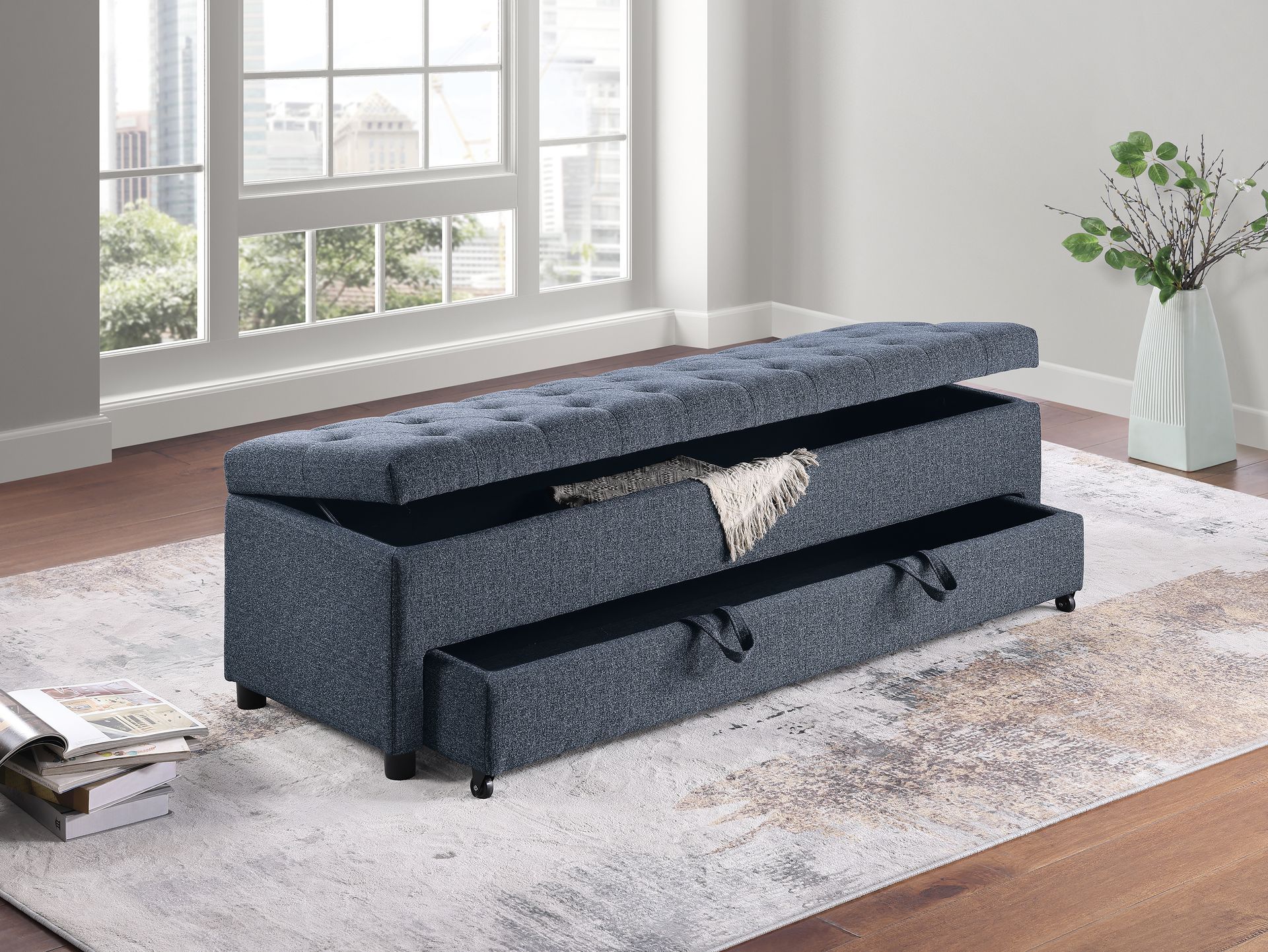 - A standout feature of this ottoman is the pull-out drawer at the base, easily accessed by two built-in handles, offering a second level of storage that glides out smoothly to hold smaller items like books, remotes, or slippers.