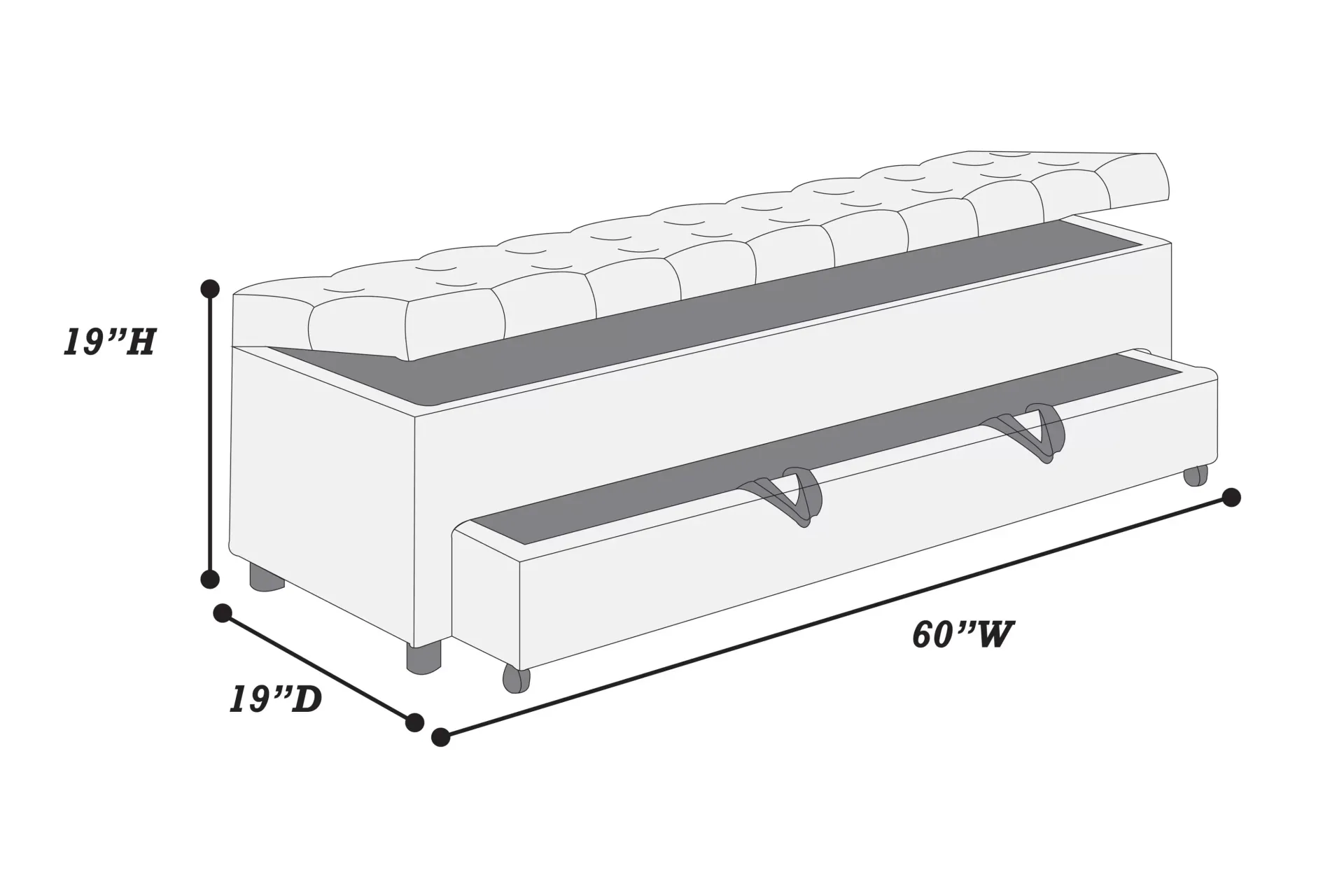- With its generously tufted top and refined design, this ottoman doubles as a comfortable bench and a discreet storage unit, making it ideal for both seating and organization in compact spaces.