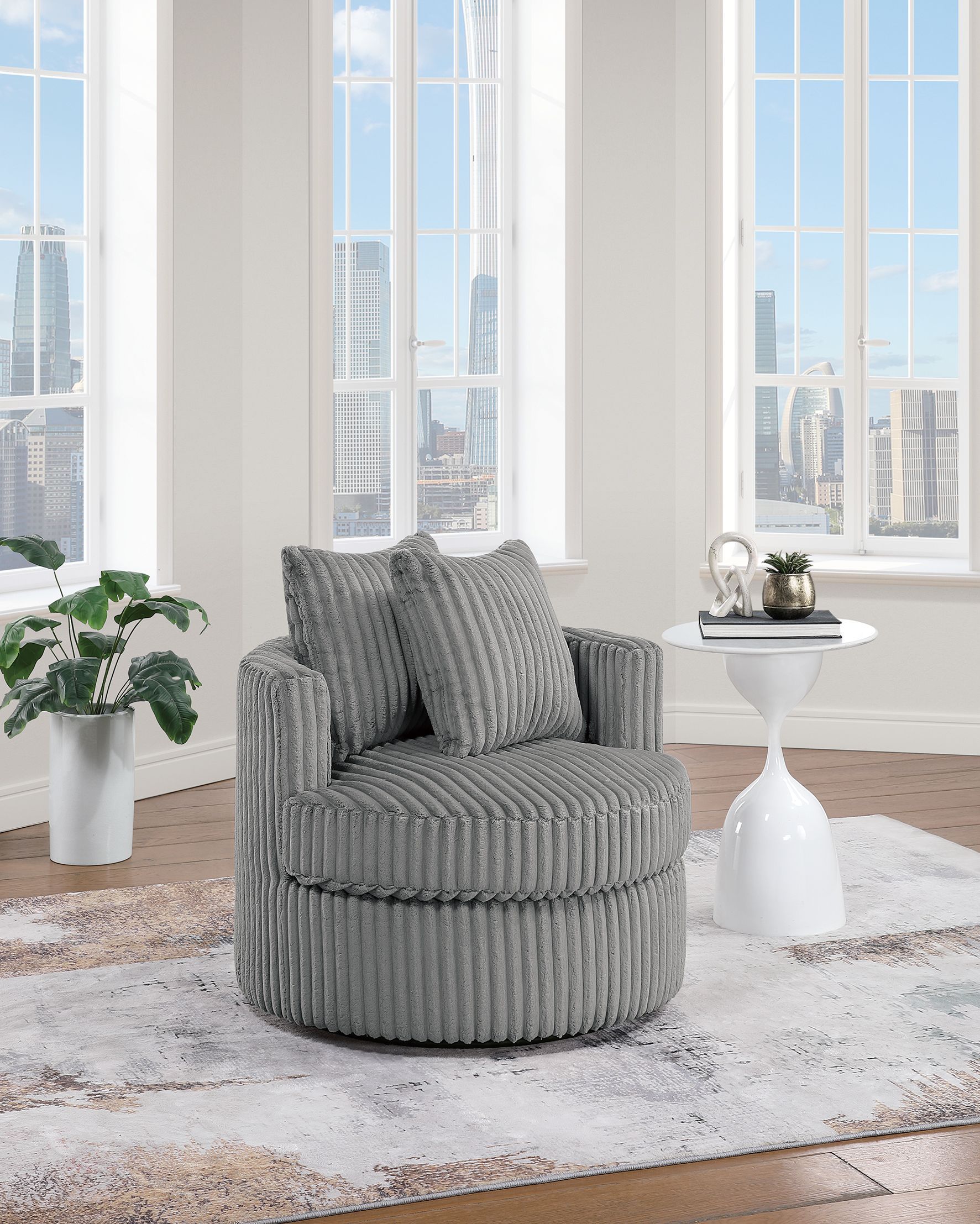 Wrap yourself in comfort with this plush swivel chair, where cozy design meets modern motion. This inviting chair features a compact silhouette with low-profile arms that blend in seamlessly into the rounded base, creating a soft, sculptural look. Upholstered in fur-like corduroy, its texture adds a warm, touchable element that invites relaxation. The 360-degree swivel base offers effortless movement, making it perfect for open-concept spaces, living rooms, or cozy corners where flexibility matters. This chair arrives fully assembled—just unbox, place, and enjoy. The removable seat cushion allows for easy cleaning and long-term use, while the two back throw pillows enhance your comfort and add a relaxed, lounge-inspired feel. Whether you're curling up with a good book or spinning toward the conversation, this swivel chair blends comfort and style with ease.