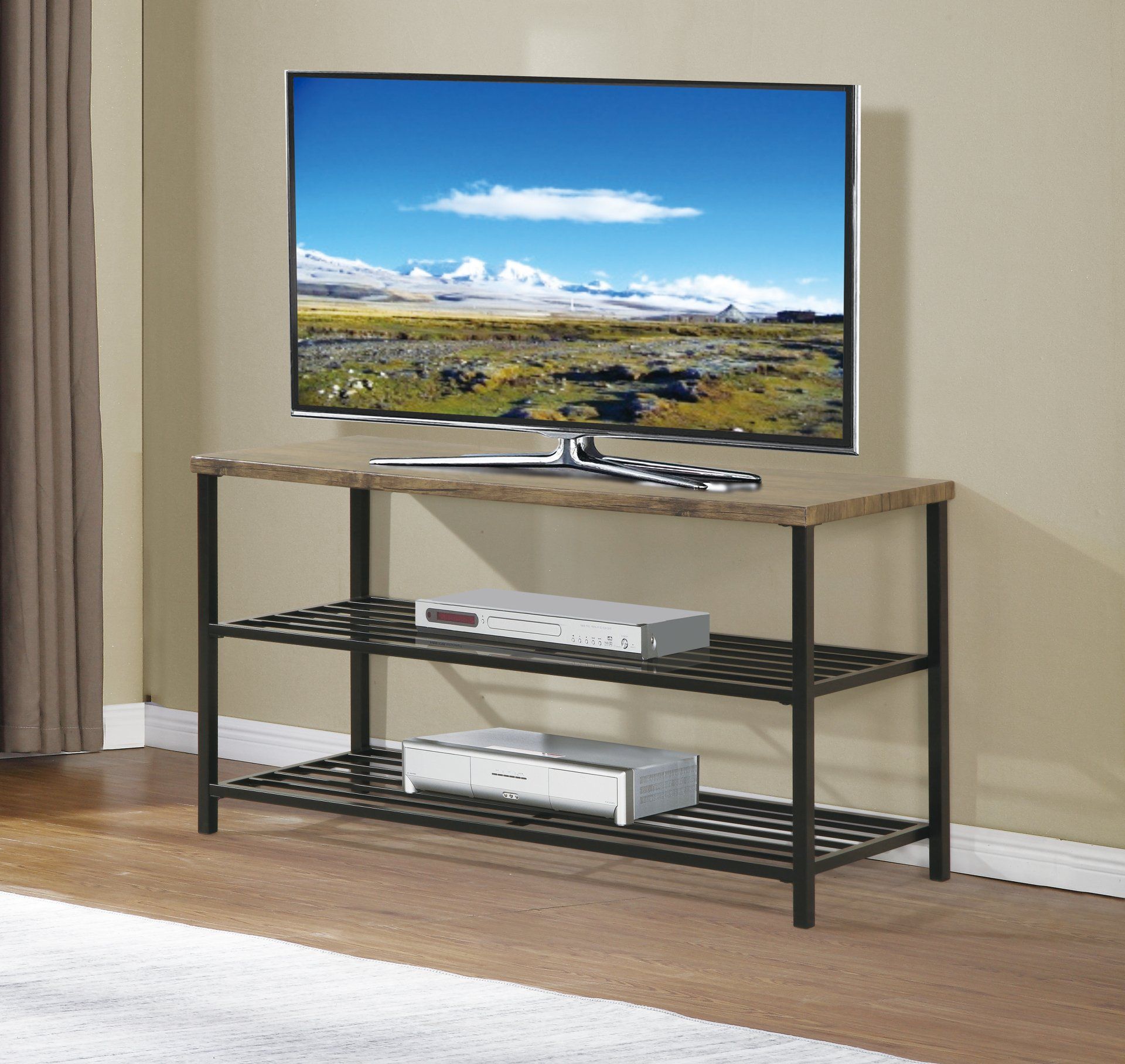 Grey shelving framed in black makes this TV stand both fashionable and practical. This unit holds up to a 55 inch TV.