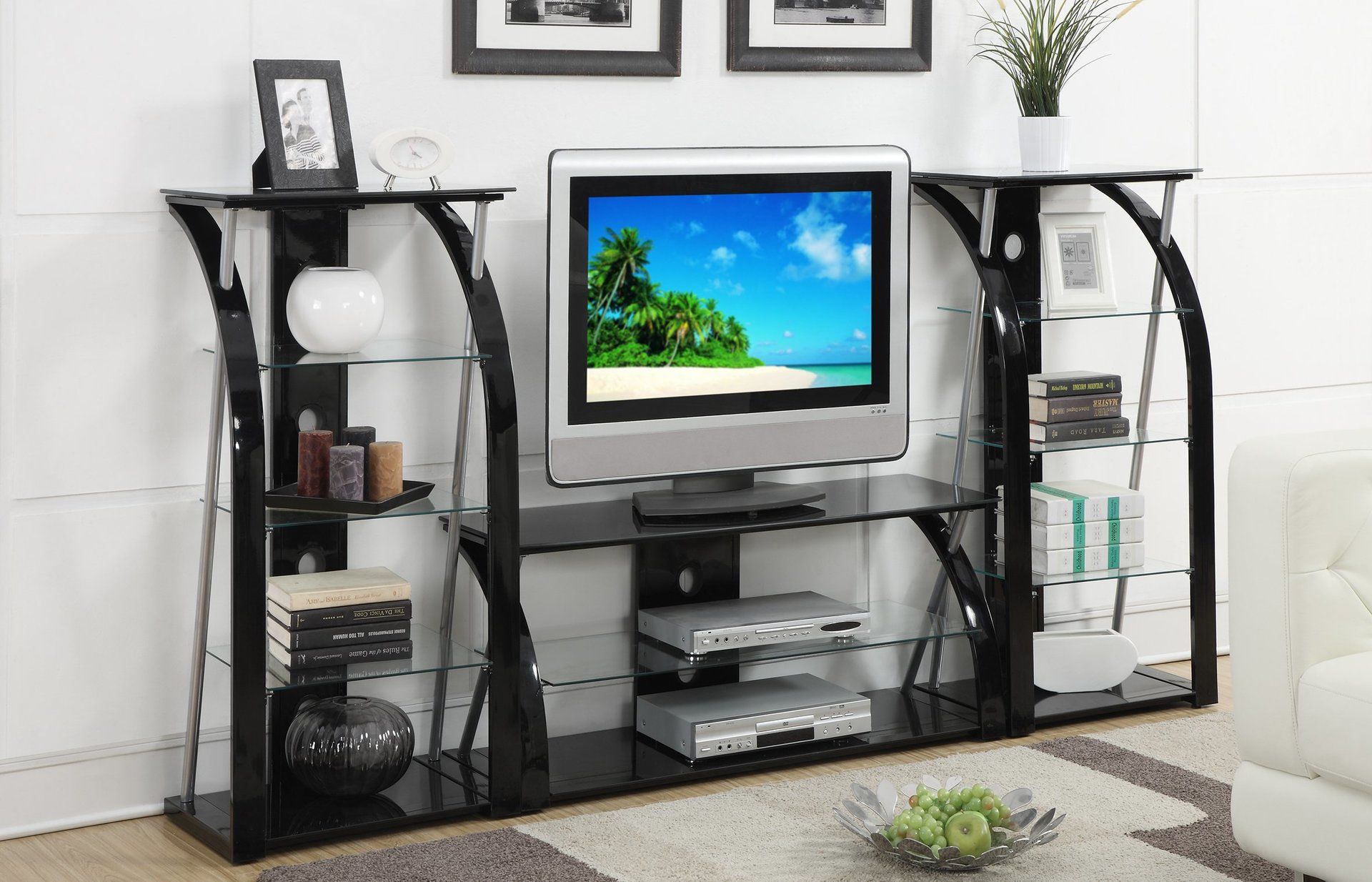 Experience home entertainment with a TV stand and media shelf that features a dynamic design while safely displaying your audio/visual appliances. Its tempered glass shelving it supported by a black frame of masterful curves and lines grabbing more attention than the television itself.