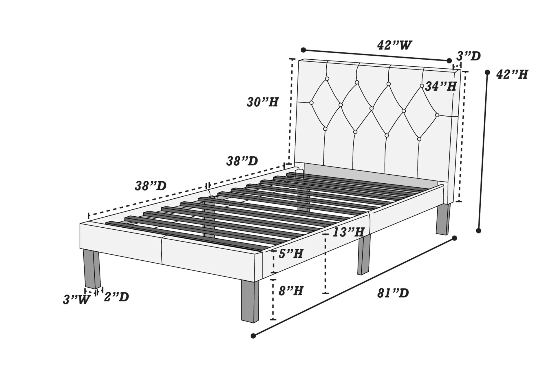 Twin Bed: HB: 42"H / FB 13"H